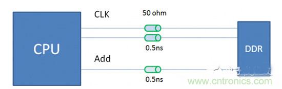 我們來(lái)回顧一下,DDR布線,線長(zhǎng)匹配的基本原則是:地址,控制/命令信號(hào)與時(shí)鐘做等長(zhǎng)。數(shù)據(jù)信號(hào)與DQS做等長(zhǎng)。為啥要做等長(zhǎng)?大家會(huì)說(shuō)是要讓同組信號(hào)同時(shí)到達(dá)接收端,好讓接收芯片能夠同時(shí)處理這些信號(hào)。那么,時(shí)鐘信號(hào)和地址同時(shí)到達(dá)接收端,波形的對(duì)應(yīng)關(guān)系是什么樣的呢?我們通過(guò)仿真來(lái)看一下具體波形。