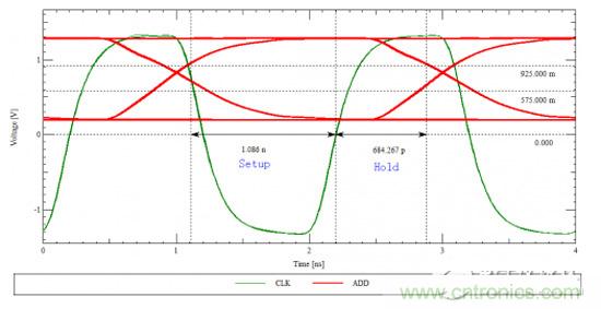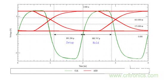 由上圖3.我們可以知道,該地址信號(hào)的建立時(shí)間大約為891ps,保持時(shí)間為881ps。這是在時(shí)鐘與地址信號(hào)完全等長(zhǎng)情況下的波形。如果地址與時(shí)鐘不等長(zhǎng),信號(hào)又是什么樣的呢?仿真中,我們讓地址線比時(shí)鐘線慢200ps,得到的與眼圖如下: