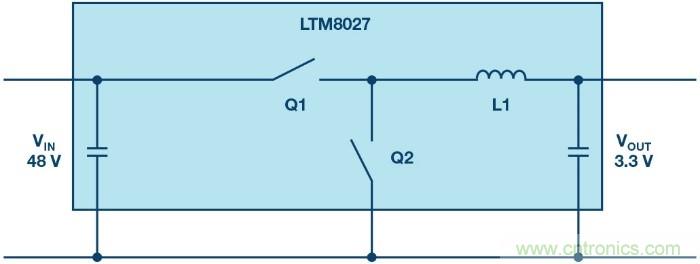 圖1 僅透過一個轉換步驟就從48伏特轉換成3.3伏特。