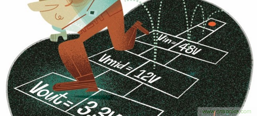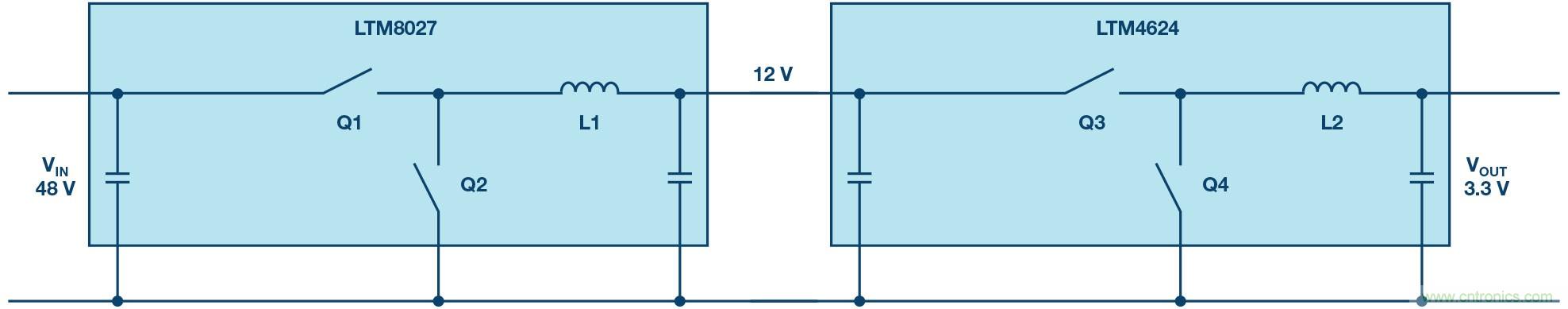 圖2 在2個步驟下電壓從48伏特轉換成3.3伏特,過程中還用到一個12伏特的中間電壓。