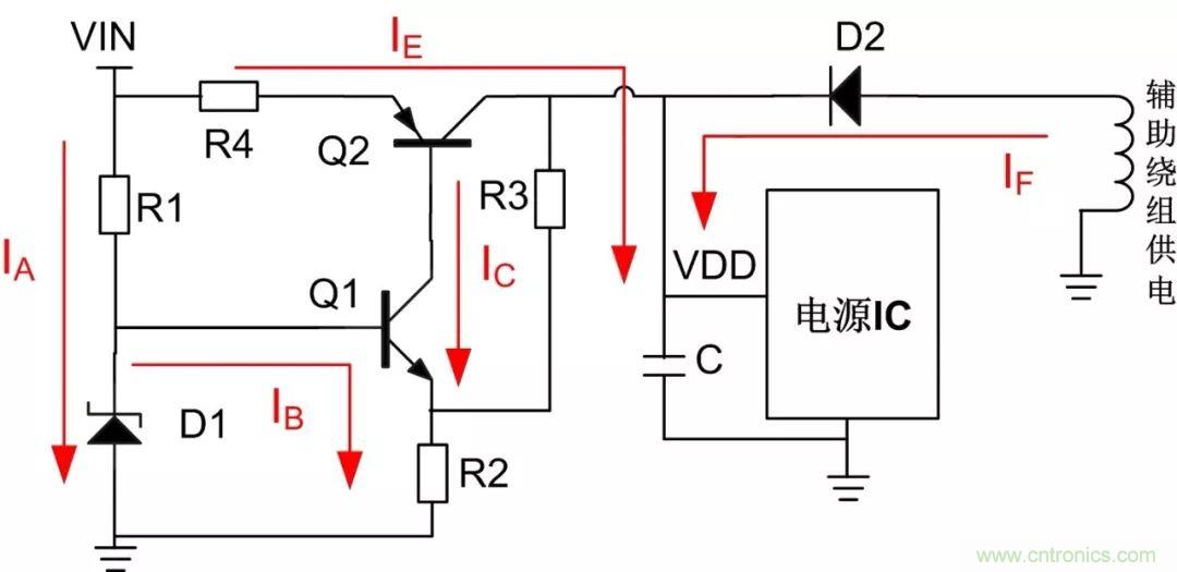 輸入電壓VIN為NPN三極管Q1提供IB電流使用它處于放大區(qū),IC為放大電流也為PNP三極管Q2的基極電流,通過對IC電流的控制,可使Q2處于飽和狀態(tài)并以IE的飽和電流向電容C充電,直到Q2處于半截止或半飽和狀態(tài)。此時,電容就等效成一個恒流源為IC芯片提供能量,當(dāng)電容電壓降到一定值時,啟動電路繼續(xù)為電容充電,直到輔助供電有電壓后,才通過電阻R2、R3之間的分壓使Q1處于截止?fàn)顟B(tài),此時啟動電路才停止工作,之后芯片的供電完全由輔助繞組提供。