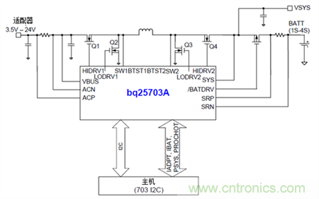 由于C型USB端口是通用的,且具有很高的功率傳輸能力,是適合此類應用的理想選擇。為了兼容具有不同電壓和功率電平的電源,諸如無人機這樣的多元電池組系統(tǒng)很有必要使用降壓升壓充電器。在飛行間隔期間,用戶能夠快速而安全地對電池進行充電也是至關重要的。bq25703A和bq25700A支持高達6.35A的充電電流,并具有廣泛的保護功能,包括有助于從各種適配器獲得最大功率的輸入電流優(yōu)化(ICO)。圖1提供了bq25703A應用圖中的附加信息。