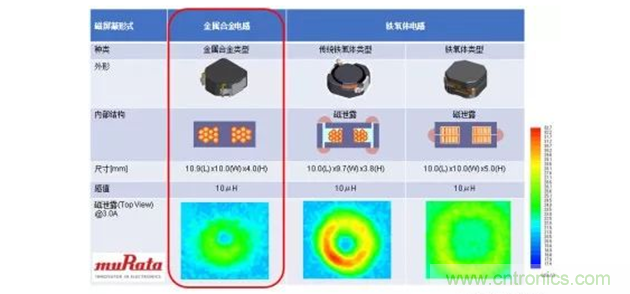 以村田公司生產(chǎn)的功率電感器為例,從產(chǎn)品工藝上可分為繞線電感和疊層電感,從材料上可分為金屬合金粉(一體成型)電感和鐵氧體電感。與鐵氧體電感相比,金屬合金電感有以下特點: