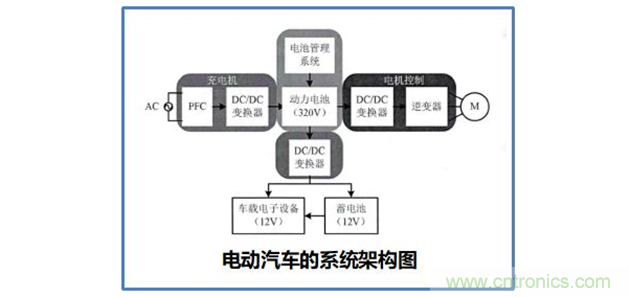 另一方面,DC/DC變換器可以將電動機制動剎車時由機械能轉(zhuǎn)化而來的電能回饋給蓄電池組,其效率高達85%~95%,遠大于發(fā)電機的正常效率。以可控的方式給蓄電池組充電,尤其是在電動汽車需要頻繁啟動和制動的城市工況運行條件下,可以有效地回收制動能量,增加電動汽車的行駛里程。因此,電動汽車采用DC/DC變換器可以優(yōu)化電動機控制、提高電動汽車的整體效率和性能。下圖為電動汽車的系統(tǒng)架構(gòu)圖。