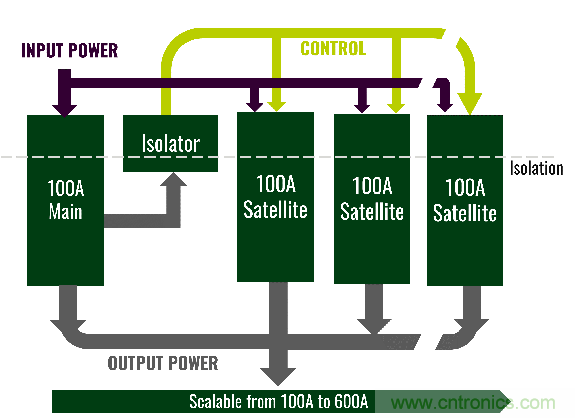 圖字:輸入電源;控制;100A主模塊;隔離器;100A從模塊;隔離;輸出電源;從100A到600A可擴展