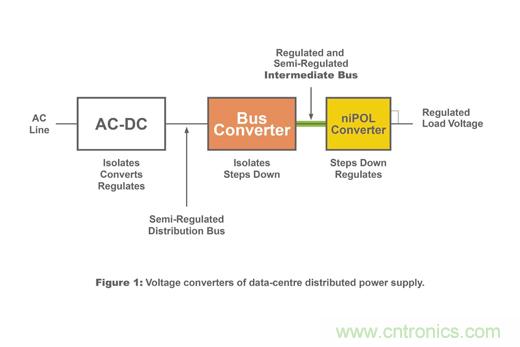 圖字:交流線路;隔離、轉(zhuǎn)換、穩(wěn)壓;半穩(wěn)壓配電總線;總線轉(zhuǎn)換器;隔離、降壓;穩(wěn)壓半隔離中間總線;niPOL轉(zhuǎn)換器;降壓、穩(wěn)壓;穩(wěn)定負載電壓