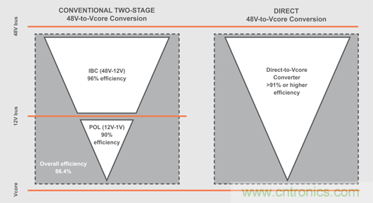 圖字:12V總線;48V總線;傳統(tǒng)的兩級48V至Vcore轉(zhuǎn)換;IBC(48V-12V);96%效率;POL(12V-1V);90%效率;總效率為86.4%;直接48V至Vcore轉(zhuǎn)換;直接至Vcore轉(zhuǎn)換器;>91%或更高的效率