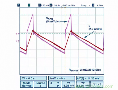 檢測(cè)電阻ESL的影響可能很輕微,也可能很?chē)?yán)重。ESL會(huì)導(dǎo)致開(kāi)關(guān)柵極驅(qū)動(dòng)器發(fā)生明顯振蕩,從而對(duì)開(kāi)關(guān)導(dǎo)通產(chǎn)生不利影響。它還會(huì)增加電流檢測(cè)信號(hào)的紋波,導(dǎo)致波形中出現(xiàn)電壓階躍,而不是預(yù)期的如圖13所示的鋸齒波形。這會(huì)降低電流檢測(cè)精度。