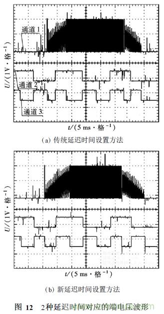 2種延遲時間設(shè)置方法對應的實測端電壓波形(通道1)如圖12所示,通道2和通道3為過零點檢測波形,通道2的上升沿和下降沿對應于過零點,而通道3的上升沿和下降沿分別對應過零點和換相點.