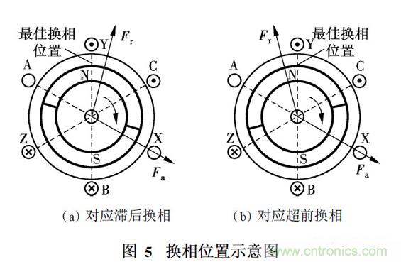最佳換相邏輯是指繞組在梯形波反電勢的平頂部分導通, 與之對應的最佳換相位置是指在換相完成后,定子磁勢超前轉(zhuǎn)子磁勢120°電角度,如圖5所示. 其中, Fa 和Fr 分別表示定子磁勢和轉(zhuǎn)子磁勢. 在一個工作狀態(tài)內(nèi)定子磁勢平均超前轉(zhuǎn)子磁勢90°電角度,平均電磁轉(zhuǎn)矩最大.