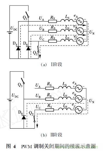 AC 和AB 區(qū)為A 相上橋臂開關(guān)PWM 調(diào)制階段. 以AC區(qū)為例,在PWM 開通期間, Q1 和Q2 導通, A 相繞組與直流側(cè)電壓的正極相連, 端電壓為UDC ;在PWM 關(guān)閉期間, Q1 關(guān)閉, Q2 導通,由于繞組阻抗呈感性, A 相下橋臂的反并聯(lián)二極管D4 導通續(xù)流,此時A 相繞組與直流側(cè)電壓的負極相連,端電壓為零.