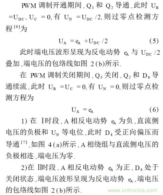 分析了上橋臂PWM 調(diào)制、下橋臂恒通調(diào)制方式時的端電壓波形,討論相應的反電動勢過零點檢測方法. 在PWM 調(diào)制信號開通狀態(tài)結(jié)束時刻對端電壓進行采樣,由軟件算法確定反電動勢過零點. 針對電機運行時存在超前換相或滯后換相的情況,通過設(shè)置合理的延遲時間來實現(xiàn)最佳換相. 針對實際電機存在反電動勢過零點分布不均勻的情況,根據(jù)過零點間隔時間存在著周期性規(guī)律,提出一種新的延遲時間設(shè)置方法,使換相點位于相鄰過零點的中間位置,實現(xiàn)了電機的準確換相. 實驗驗證了所提出方法的可行性和有效性.