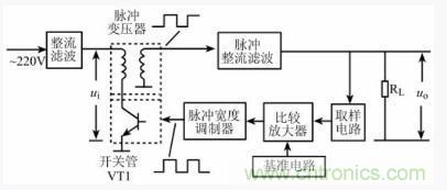 開關管VT1的工作狀態(tài)受脈沖寬度調(diào)制器輸送來的開關脈沖信號的控制呈周期性的導通與截止,由此在開關管集電極上形成脈沖電壓,經(jīng)脈沖變壓器耦合,其次級就可得到相應的脈沖電壓,該電壓再經(jīng)脈沖整流濾波電路處理后得到直流輸出電壓uo。