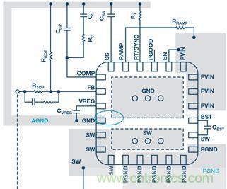 AGND 有時(shí)被稱為 SGND(信號接地層),是其他信號用作參照的接地連接,通常十分平靜。該接地層包括調(diào)節(jié)輸出電壓所需的內(nèi)部基準(zhǔn)電壓。軟啟動和使能電壓也以 AGND 連接為參照。
