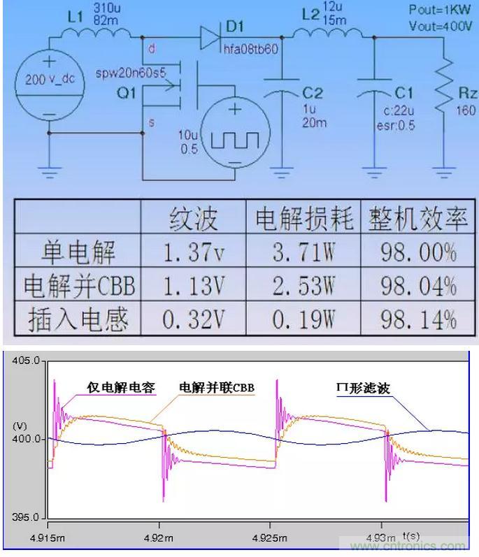 提出的辦法是:用電感將電解和CBB分開,CBB位于高頻紋波電流側(cè),電解位于直流(工頻)側(cè),各自承擔對應(yīng)的濾波任務(wù)。