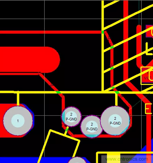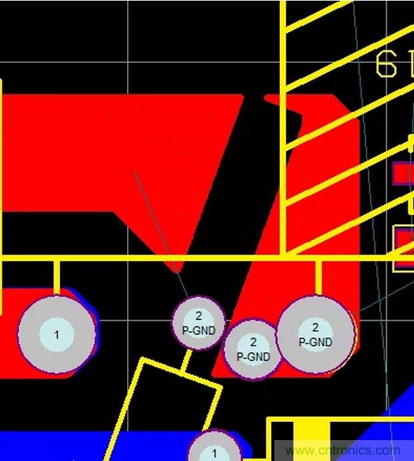 47.PCB的熱點(diǎn)區(qū)域一定要遠(yuǎn)離輸入、輸出端子,防止噪聲源串到線(xiàn)上導(dǎo)致EMI變差,在不得已而為之時(shí),可增加地線(xiàn)或其它屏蔽方式進(jìn)行隔離,如下圖增加了一條地線(xiàn)進(jìn)行有效隔離。