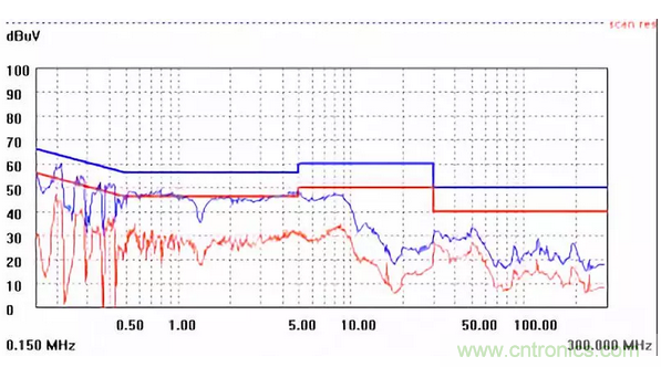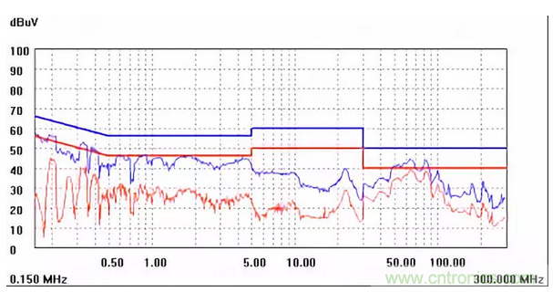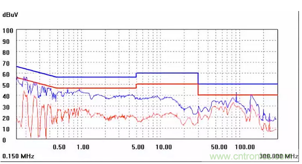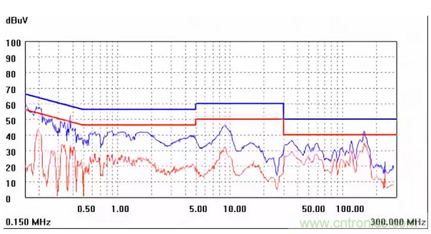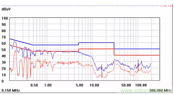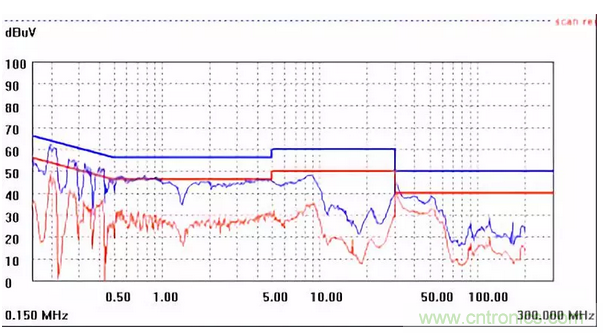 圖一a可以看出,改變PCB布局后130M-200M已經(jīng)完全被衰減,但是30-130M沒(méi)有圖一效果好,可能變壓器出線(xiàn)無(wú)交叉好一些。仔細(xì)觀察,此IC具有抖頻功能,傳導(dǎo)部分頻段削掉了一些尖峰;