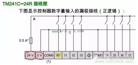 如圖三所示,這是PLC 的硬件手冊,我們要想把接近開關(guān)的信號接到輸入點I0上,也就是黃色熒光筆部分,該怎么辦呢?其實很簡單,看紅色圓圈的部分,PLC已經(jīng)為我們提供了輸出電源,我們只需把接近開關(guān)的三根線依次接上即可
