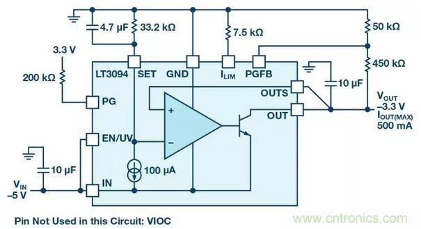 LT3094采用小尺寸、低成本的10μF陶瓷輸出電容工作,可優(yōu)化穩(wěn)定性和瞬態(tài)響應(yīng)。利用單個(gè)電阻器可編程外部精密電流限值(±10%過(guò)溫)。該器件的VIOC引腳可控制前端穩(wěn)壓器,以最大限度地降低功耗并優(yōu)化PSRR。單個(gè)SET引腳電容可降低輸出噪聲,并提供基準(zhǔn)軟啟動(dòng)功能,防止輸出電壓在開啟時(shí)過(guò)沖。此外,該器件的內(nèi)部保護(hù)電路還包括具有折返功能的內(nèi)部限流和帶遲滯的熱過(guò)載。其他功能包括快速啟動(dòng)功能(如果使用的SET引腳電容值較大,則非常有用)和電源良好標(biāo)志(業(yè)界首款具有此功能的負(fù)輸出LDO穩(wěn)壓器),具有可編程閾值,用于指示輸出電壓調(diào)節(jié)。