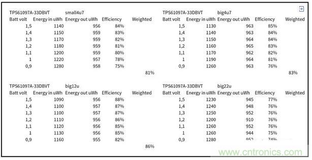 Otii工具讓效率計(jì)算變得非常簡(jiǎn)單,只需將輸出能量除以輸入能量即可,然后根據(jù)案例一測(cè)量設(shè)置中的說(shuō)明對(duì)該效率值進(jìn)行加權(quán)。圖5為所有三個(gè)DC/DC轉(zhuǎn)換器提供了一個(gè)概覽。