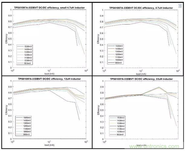 使用與之前相同的設(shè)置,選擇TPS61097A-33DBVT作為DC/DC轉(zhuǎn)換器,電感器作為變量(圖6)。