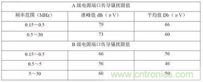 開關(guān)電源的傳導(dǎo)騷擾是通過電源的輸入電源線向外傳播的電磁干擾。在開關(guān)電源輸入電源線中向外傳播的騷擾,既有差模騷擾、又有共模騷擾,共模騷擾比差模騷擾產(chǎn)生更強的輻射騷擾。傳導(dǎo)騷擾的測試頻率范圍為150KHz~30MHz,限值要求如下表1 所示:
