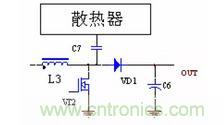 圖中C2 是二極管VD1 和VD2 與散熱器之間的耦合電容,容量一般在幾十PF,C3 是增加的電容,C3 要遠(yuǎn)大于C2,DC/DC 整流管、續(xù)流管上的電壓峰值經(jīng)過C2 與C3 的分壓,幅度大大降低,就可以大大減小向外的輻射。
