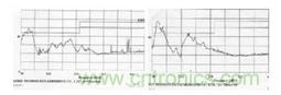 下面圖 9 是采取在PFC 開關(guān)管散熱器對PFC 輸出地加電容與不加電容輻射強度的對比。
