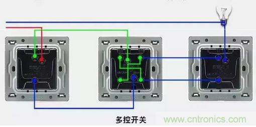 這里要新介紹一個(gè)開關(guān),叫做三控開關(guān)。開關(guān)布置的順序是,單開雙控→三控開關(guān)→單開雙控。先看個(gè)三控開關(guān)的圖,能更好理解,如下: