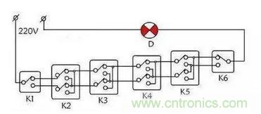 這樣的線路在電梯中常用,當(dāng)然有時(shí)臥室改的細(xì)致一點(diǎn),床左右都加上開關(guān),門口再一個(gè),也是單聯(lián)三控線路了。