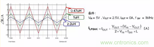 在這里,為加深對電感工作的理解,進(jìn)一步說明電感值變化時電感電流如何變化的情形。下圖表示在相同工作條件下將電感值設(shè)為0.4μH、1μH、2.2μH時ILPEAK。