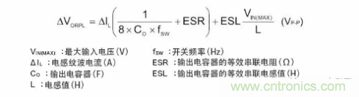 輸出紋波電壓是通過上圖的電感電流IL紋波ΔIL和輸出電容器的容值、ESR、ESL所產(chǎn)生的電壓合成波形,用下面公式表示。