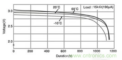 圖5:在190μA的典型無線傳感器平均電流負(fù)載和20°C的工作溫度下,CR2032電池可維持>2.7V電壓1000 小時。(圖片來源:Panasonic)