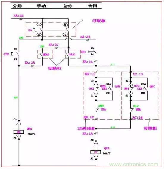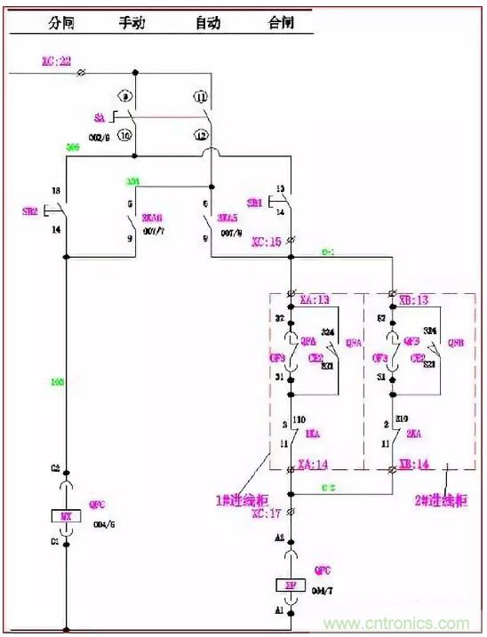 手動時:萬轉(zhuǎn)SA的1、2腳連通。當(dāng)Q2、Q3合閘,Q1合閘回路A-2、A-3斷開,其合閘線圈XF無法得電, Q1不能滿足合閘條件;同理,當(dāng)Q1、Q2或Q1、Q3同時合閘時,Q2或Q3也同樣不能滿足合閘條件。使進(jìn)線柜與母聯(lián)滿足“三合二”邏輯。