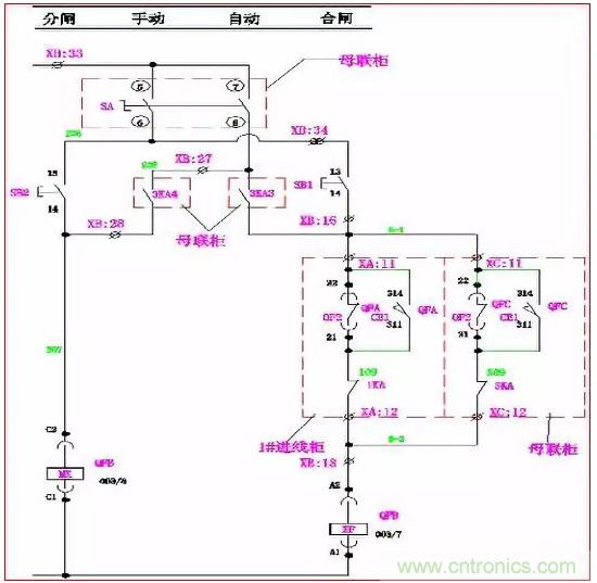 手動時:當(dāng)QFA、QFB合閘,QFC合閘回路C-1、C-2斷開,其合閘線圈XF無法得電, QFC不能滿足合閘條件;同理,當(dāng)QFA、QFC或QFB、QFC同時合閘時,QFB或QFA也同樣不能滿足合閘條件。使進(jìn)線柜與母聯(lián)滿足“三合二”邏輯。