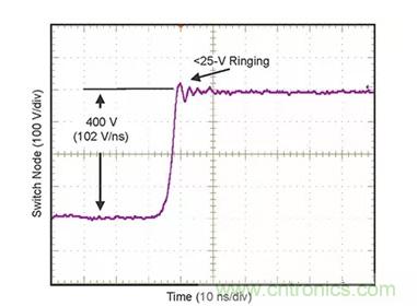 該芯片的壓擺率可達(dá) 100 伏/納秒 (ns) 且瞬時(shí)振蕩近乎為零(圖 3)。相比之下,傳統(tǒng)硅功率 MOSFET 的壓擺率典型值為 3 至10 V/ns。