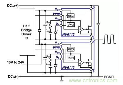 圖4:如圖所示,Navitas 的 NV6113 可并行部署,用于半橋拓?fù)浣Y(jié)構(gòu)。(圖片來源:Navitas Semiconductor)