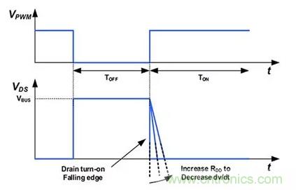 圖6:RDD 電阻器的大小決定了 NV6113 導(dǎo)通電流和功率 FET 漏極的導(dǎo)通(下降)沿壓擺率。(圖片來源:Navitas Semiconductor)