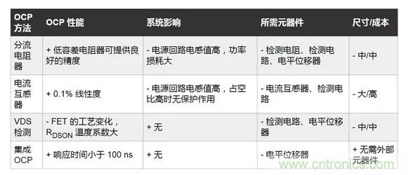 一種傳統(tǒng)的 OCP 方法是使用電流互感器、分流電阻器或去飽和檢測(cè)電路(如下表)。然而,這會(huì)增大電源回路的寄生電感和電阻,反而需要降低壓擺率,且導(dǎo)致功率耗散升高,從而對(duì)系統(tǒng)性能產(chǎn)生不利影響。此外,互感器或分流電阻器等分立器件會(huì)增加成本,占用電路板空間。