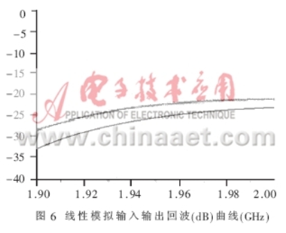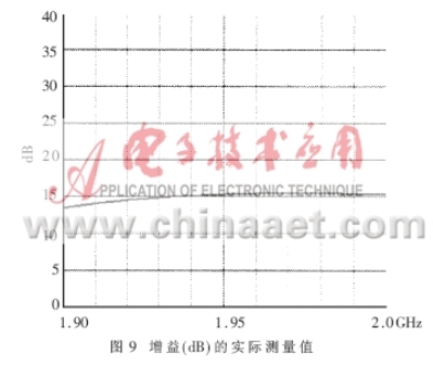 得到了完整的電路PCB板后,就要實(shí)際測量電路的各個(gè)參數(shù),驗(yàn)證設(shè)計(jì)的仿真結(jié)果是否與之相符,是否最終符合表1的設(shè)計(jì)技術(shù)規(guī)范。本文所采用的測試儀器是HP8753ES網(wǎng)絡(luò)分析儀和HP8970B噪聲儀。圖8、圖9表達(dá)出放大器實(shí)測的NF和增益曲線,在帶寬為0.1GHz的頻率范圍內(nèi)NF的值在0.8dB和1.0dB之間,增益在1.97GHz達(dá)到最大值15.5dB,在1.99GHz達(dá)到了15.3dB。由于NF是在實(shí)際PCB板外腔體內(nèi)測得的,包含了同軸連接器的損耗和二級(jí)噪聲損耗,其測量指標(biāo)表明實(shí)際的電路NF特性要稍差于模擬特性。圖10是輸入、輸出的回波曲線。當(dāng)頻點(diǎn)在1.96GHz時(shí),輸入回波為18dB,輸出回波達(dá)到22.5dB,放大器的OIP3在直流偏置Vds=3V,Id=60mA時(shí)測得值為37dBm,P1dB為21.4dBm。電路在較低的偏置狀態(tài)下Vds=3V,Id=40mA放大器的NF和增益都沒有降低,只有OIP3測出下降為36.5dBm。