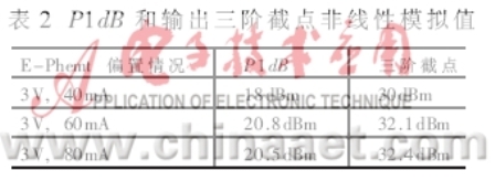 對(duì)于非線性模擬,常以諧波平衡模擬(HB)來實(shí)現(xiàn)。非線性模擬方法HB計(jì)算速度快,能夠處理分布元件和分立元件的電路,并很容易與更高階諧波及互調(diào)元件相容。ATF-54143管的P1dB和OIP3模擬非線性模型是基于W.R.Curtice模型,這個(gè)模型可以非常近似地模擬直流和小信號(hào)工作狀態(tài)(包括噪聲),對(duì)于截點(diǎn)的模擬則做出模擬預(yù)測結(jié)果比實(shí)際值要偏低。P1dB和OIP3的值如表2 所示:當(dāng)平衡LNA放大器的OIP3模擬結(jié)果為32.1dBm時(shí),P1dB則為20.8dBm,P1dB的模擬結(jié)果與實(shí)際的測量結(jié)果很接近,而OIP3的模擬結(jié)果則偏低,實(shí)際的測量結(jié)果達(dá)到37dBm。