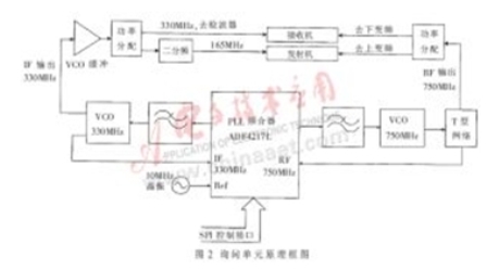圖2為詢問單元方框圖。它由發(fā)射機、接收機、本地振蕩模塊等部分組成。