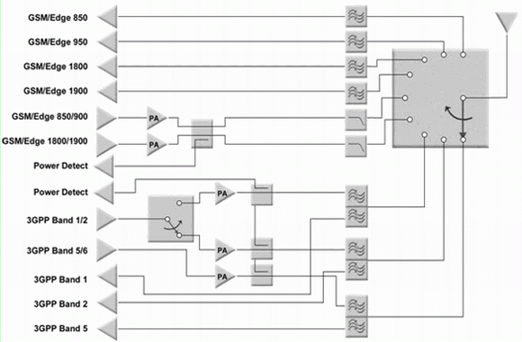 隨著多頻段架構(gòu)的普及,對功放和相關(guān)濾波器的數(shù)量提出了嚴(yán)格的要求。事實(shí)上,對功放的技術(shù)要求沒有變化,但手機(jī)設(shè)計(jì)需要使用更多的功放。因此真正改變的是需要一個(gè)特別高效的方法將所有射頻信號傳送給天線-單片開關(guān)。