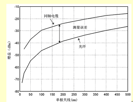 一般地講,我們不知道發(fā)射元件的效率和放大器的增益分別是多大(至少不能通過(guò)測(cè)量得到,但可以通過(guò)模擬或者模型分析得到這些數(shù)據(jù))。相反,G/T損失是直接通過(guò)測(cè)量天線的輸出噪聲總功率得到的,這時(shí)天線是放在一個(gè)特殊的環(huán)境中(例如在消聲室中,Ta=T0),增益是用增益置換法借助一個(gè)增益已知的參照天線通過(guò)測(cè)量得到的。但是要小心。要通過(guò)標(biāo)定把測(cè)量設(shè)備產(chǎn)生的噪聲去掉,在測(cè)量時(shí)沒(méi)有金屬物體(同軸電纜線或者電源線)和它相連。由于這個(gè)原因,萊爾德科技公司研制了一種代替電纜線的系統(tǒng),它利用了光纖的原理,連同一個(gè)用電池供電的前置放大器,這些在一起可以妥善地測(cè)定小天線的電氣特性(見(jiàn)圖1)。估計(jì)同軸電纜線引入的測(cè)量誤差的設(shè)置如圖2所示。圖2中,在單極天線從基板上伸出來(lái)的長(zhǎng)度不同的情況下,用同軸電纜線和光纖系統(tǒng)測(cè)量了它們的增益??梢钥吹?,在長(zhǎng)度為10mm左右(這是內(nèi)置天線的實(shí)際長(zhǎng)度)時(shí),測(cè)量誤差超過(guò)20dB。