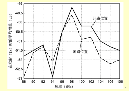 在發(fā)射時(shí),發(fā)射元件起標(biāo)準(zhǔn)的無(wú)源天線作用,它用一個(gè)單刀單擲(SPST)通斷控制進(jìn)行連接(見(jiàn)圖4)。前置放大器處在Rx狀態(tài),仍然與天線連接(但是切斷電源)。用一個(gè)內(nèi)阻為50Ω的信號(hào)源供給信號(hào)時(shí),失配的半圈天線的增益測(cè)定值如圖7所示。寬帶范圍的平均增益(或者效率)達(dá)到-53~-49dB。在開(kāi)關(guān)和調(diào)頻發(fā)射組件之間接入一個(gè)匹配網(wǎng)絡(luò),或者選擇適當(dāng)?shù)墓Ψ泡敵鲎杩?,那么?duì)輸出功率的要求可以放寬很多。