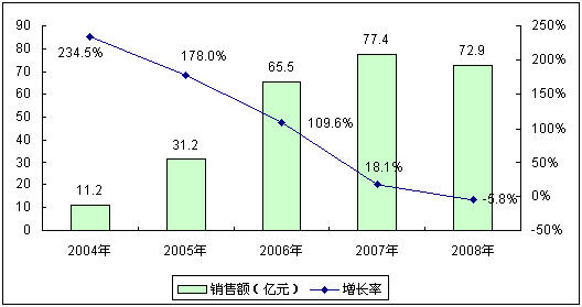 圖2 2004-2008年中國(guó)安防領(lǐng)域RFID市場(chǎng)規(guī)模與增長(zhǎng)(銷售額)