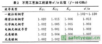 由Benson和AILison對(duì)各種不同工藝加工的口徑為25.4mm×12.7mm銅波導(dǎo)管,測出KT1,KT2,Kp之后,據(jù)上式算出的α′/α之值見表2[1]。[page]