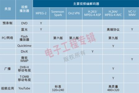 對于想在手機(jī)上觀看視頻的用戶來說,移動(dòng)多媒體處理器需要識(shí)別和支持多種視頻編碼標(biāo)準(zhǔn)。表1列出了目前在用的各種視頻編解碼器。內(nèi)容兼容性是支持“任何地方,任何內(nèi)容”這個(gè)理想目標(biāo)的關(guān)鍵。為了推進(jìn)移動(dòng)視頻的普及,用戶不必知道他們的設(shè)備支持何種格式或分辨率。用戶也許不能在他們的手機(jī)上以全高清的分辨率觀看高清編碼的視頻,但他們希望能用手機(jī)播放出來,并能輸送到電視機(jī)上觀看。