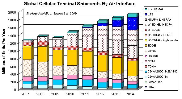 GaAs功放在無(wú)線手機(jī)射頻前端應(yīng)用中一直保持較高的使用率,盡管有CMOS功放虎視眈眈,但在3G領(lǐng)域,GaAs以其高線性度、高效率的特性處于絕對(duì)的市場(chǎng)領(lǐng)先地位,而CMOS功放由于性能、功耗等因素影響,只能用于短距離、低功率的領(lǐng)域,比如WLAN、PHS等。隨著3G的演進(jìn),GaAs的市場(chǎng)空間將穩(wěn)步上升,下圖為市場(chǎng)調(diào)研公司提供的全球手機(jī)終端出貨情況。