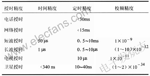 衛(wèi)星授時GPS導(dǎo)航系統(tǒng):提供的時間信號對世界協(xié)調(diào)時跟蹤,精度優(yōu)于100ns。GPS全球覆蓋,接收設(shè)備體積小,可以接收6顆衛(wèi)星信號,可用來提供2.048Mbit/s基準(zhǔn)時間信號。俄羅斯的GLONASS衛(wèi)星導(dǎo)航系統(tǒng):目前系統(tǒng)未完成完善,接收設(shè)備商業(yè)化不夠。中國的北斗導(dǎo)航系統(tǒng):精度達到50ns,目前覆蓋中國,同步衛(wèi)星信號接收設(shè)備體積較大,系統(tǒng)還未建成。(3)網(wǎng)絡(luò)授時:通過互聯(lián)網(wǎng)授時。使用NTP(NetworkTimeProtocol,網(wǎng)絡(luò)時間協(xié)議,RFC1305)。(4)電話授時:通過公共電話網(wǎng),用戶用調(diào)制解調(diào)器接首時間信號。(5)電視授時:通過電視網(wǎng)授時。(6)電信有線傳輸網(wǎng)授時表1是授時精度比較表1